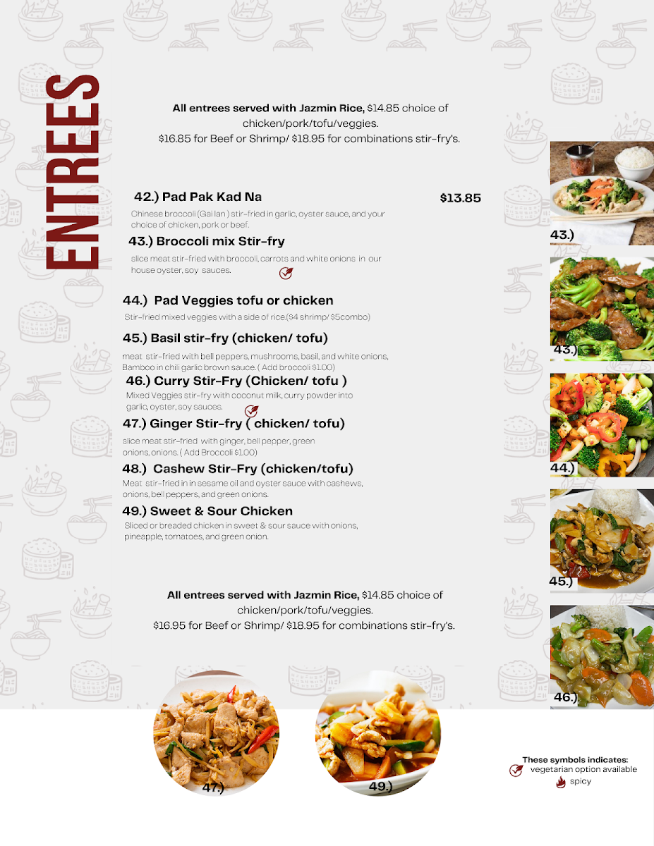 Vegetarians will also find a satisfying selection, such as the Pad Tofu, featuring sautéed tofu enveloped in a luscious garlic-oyster sauce that creates a delightful taste sensation. The Pineapple Fried Rice is another must-try; it's a colorful medley of ingredients, including juicy pineapple chunks and vibrant vegetables, all wok-fried to perfection, making it a symphony of flavors and textures.